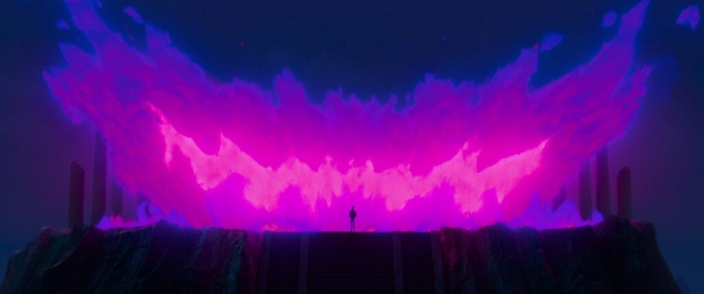 FM: Sim, definitivamente. O final na sequência do estádio, com a versão maior e mais furiosa de Gwima, foi o maior desafio para nós. Ele é uma criatura gigante feita de fogo estilizado, e continuou crescendo e mudando de forma ao longo do filme. Tivemos que misturar efeitos 3D procedurais com animação 2D desenhada à mão para manter a aparência viva e expressiva. Houve muita troca de ideias entre os departamentos e diferentes membros da equipe de efeitos especiais, mas nós e o cliente ficamos muito satisfeitos com o resultado.